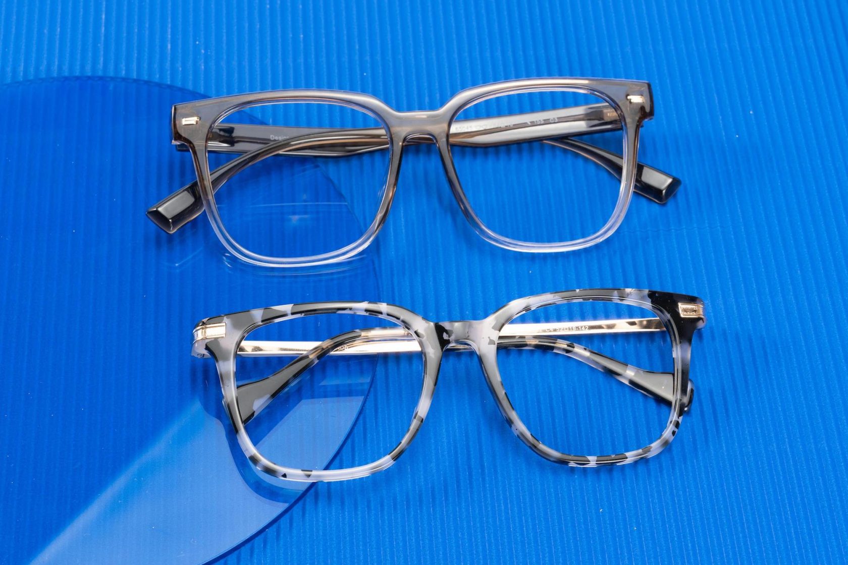- Transparente oder semi-transparente Acetatrahmen in edlen Nuancen wie Toffee, Beige oder klassischem Marineblau unterstreichen den klaren, akademischen Look perfekt.